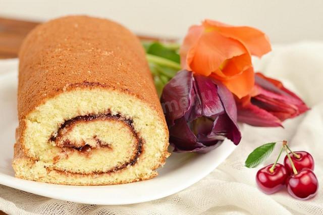 7. Пока корж горячий смазываем его повидлом, сворачиваем в рулет.