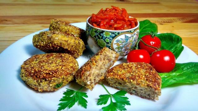 Из массы сформировать биточки, обвалять в панировке из кукурузной крупы.