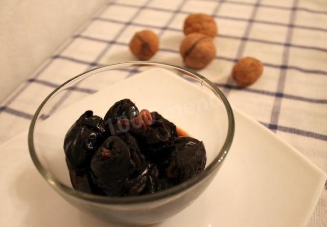 Есть второй способ. Чернослив в вине, начиненный орехом, ставят в духовку почти на час при температуре 160 градусов. После чего также ставят в прохладное место на ночь.