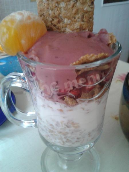 Берем красивую креманку, либо бокал Айриш, как у меня, и слоями выкладываем такие компоненты, как - закваска молочная 0%, в неё крошим хлопья фитнесс, затем творожная сырная масса "Машенька" затем творог, после повторяем слой с "Машенькой". Сверху присыпаем орехами и украшаем печеньем из цельнозерновой муки.