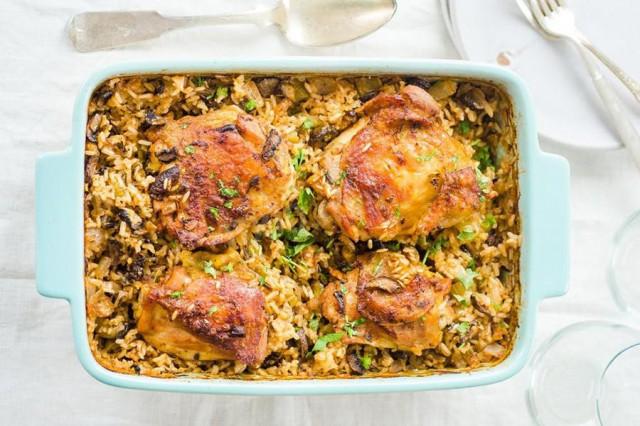 Вводим паприку, тимьян, черный молотый перец и соль, все перемешиваем и выкладываем в глубокую антипригарную форму. Поверх риса выкладываем куриные бедра, заливаем содержимое куриным бульоном.