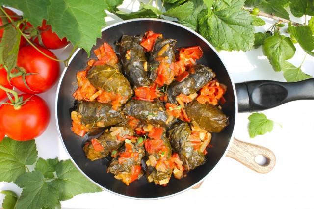 Сочные и невероятно вкусные рулетики из листьев винограда! Помидорный соус сделает долму очень ароматной и насыщенной. Листы винограда можно использовать замороженные, маринованные или свежие. Фарш возьмите любой или даже смешайте несколько видов мяса.