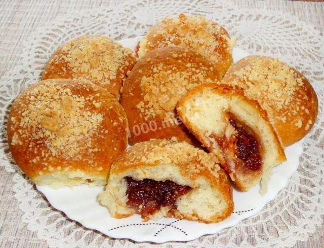 Булочки смазываем растительным маслом и посыпаем крошкой. Включаем духовку и разогреваем до температуры 180 градусов.