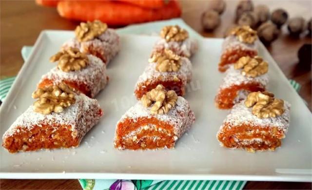 Далее морковь с кокосовой стружкой скрутить в ролл и убрать в холодильник на 1 час.