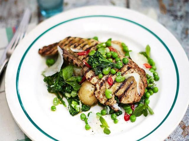 Разогреваем сковородку на среднем огне и выкладываем мясо, обжариваем каждую сторону в течение 2 минут. Подаем на стол эскалопы на сервировочном блюде, дополнив отварными овощами и украсив целыми листиками мяты.
