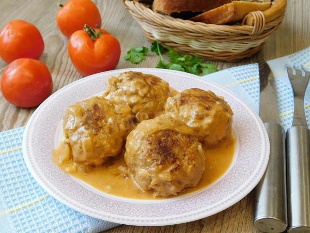 Выложите мясные шарики и обжарьте их со всех сторон до румяного цвета. Затем вторую луковицу мелко нарежьте и добавьте в сковороду к мясным шарикам. Обжарьте пару минут все вместе.