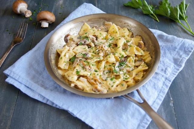 Пасту подавать со сливочно-грибным соусом, тертым сыром и измельченной петрушкой.