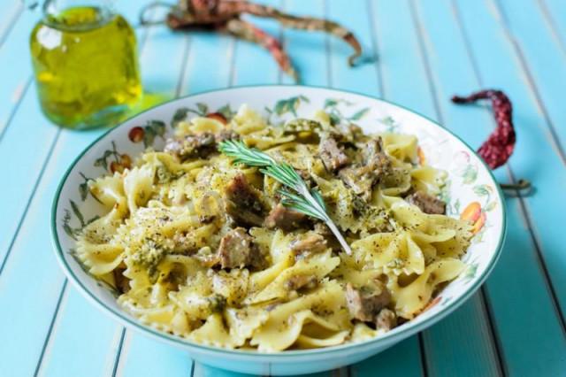Фарфалле с куриным филе, кедровыми орешками и песто