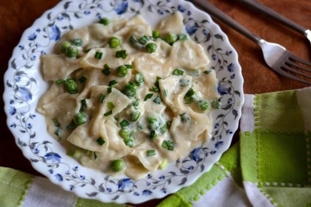 В другой сковороде разогрейте масло. Добавьте мелко нарезанный чеснок и обжарьте до слегка золотистого цвета. Добавьте свежий зеленый горошек и помешивайте в течение нескольких минут. Добавьте приготовленный соус, мелко нарезанный лук и хорошо перемешайте. Снимите с огня и отложите.