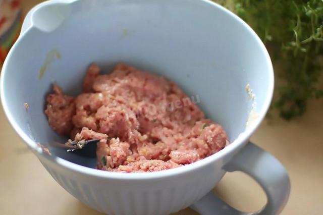 Далее следует посолить фарш по своему вкусу и добавить немного черного молотого перца для остроты. Также на этом этапе можно добавить любые приправы по желанию. С куриным мясом хорошо сочетаются орегано, тмин, мускатный орех, молотый коринандр. Или можно добавить готовую смесь итальянских трав.