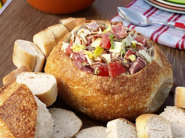 Вырезать в центре каждого хлебушка отверстие так, чтобы получился горшочек. Нужно постараться вырезать весь мякиш, но при этом не повредить стенки булочки. Остывшим салатом из мяса и овощей нафаршировать хлебушки. Оставшийся мякиш порезать на кусочки и подавать вместе с фаршированными хлебцами.