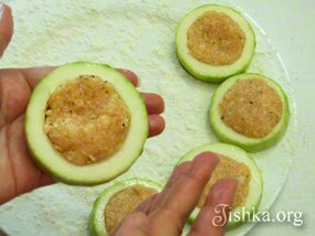При помощи маленькой рюмки вырезать серединки (они в приготовлении не понадобятся, их можно поджарить как обычные кабачки в муке).