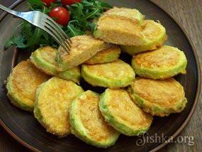 Кабачок помыть, почистить от кожицы, нарезать кольцами толщиной 1см.