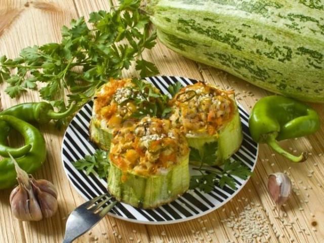 1. Очищаем кабачок от кожуры, нарезаем кружочками 5 см шириной. Сердцевину вынимаем так, чтобы получилась форма стаканчика. Натираем солью.
