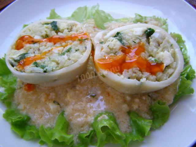 Фаршируя кальмары, не забивайте их основательно – иначе начинка во время готовки вывалится, ведь кальмары «съежатся» во время готовки.