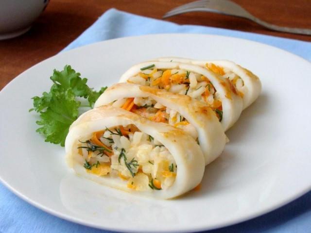 В предварительно очищенные кальмары укладываем начинку. Закрепляем края зубочисткой. Небольшой совет для тех, кто считает, что чистить кальмары – это сложный процесс. Его можно значительно упростить. Тушки кальмаров обдаем кипятком, потом остужаем холодной водой. После такого «контрастного душа» верхняя пленочка легко сходит.
