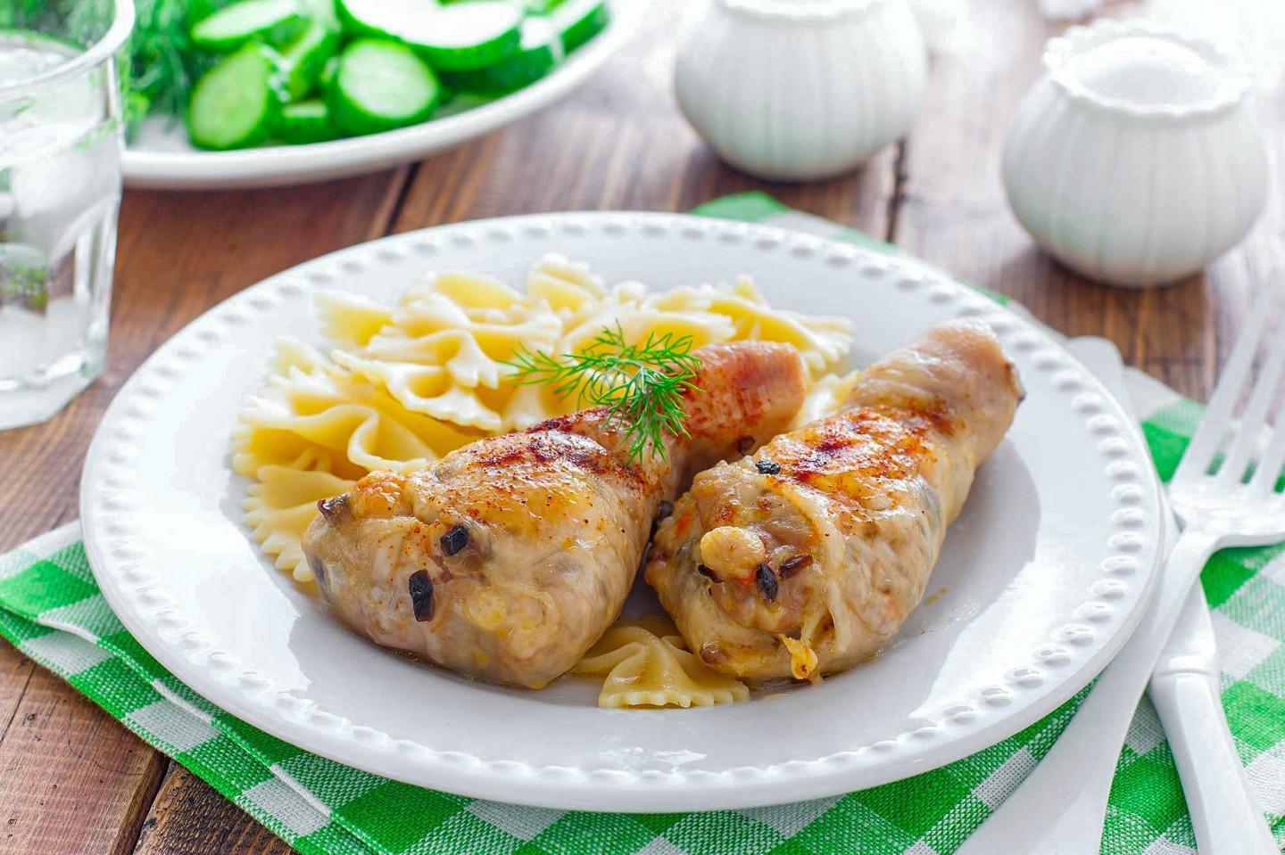 Как запечь куриные ножки, фаршированные шампиньонами? Подготовьте указанные ингредиенты. Фаршировать будем куриные голени. Разморозьте их предварительно, если они были заморожены. Шампиньоны я беру свежие, но вы можете использовать консервированные или замороженные. Сыр подойдет любой, какой нравится или какой есть дома.