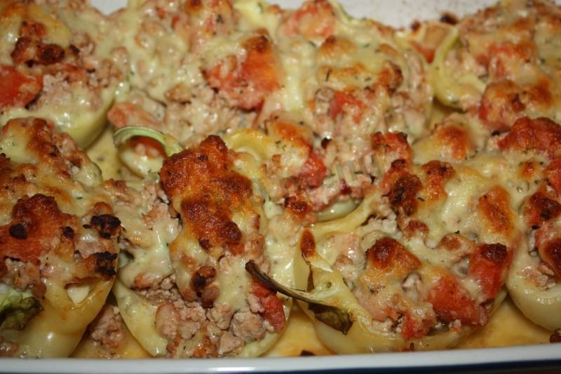 4. Теперь на противень, на котором будет готовится наше блюдо, выкладываем половинки перца. В каждую половинки накладываем уже готовую начинку из фарша.