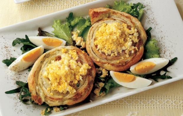 Теперь можно сервировать наше блюдо. Салат разложим по тарелкам, сверху кладём рулетики и посыпаем перетёртым яйцами.