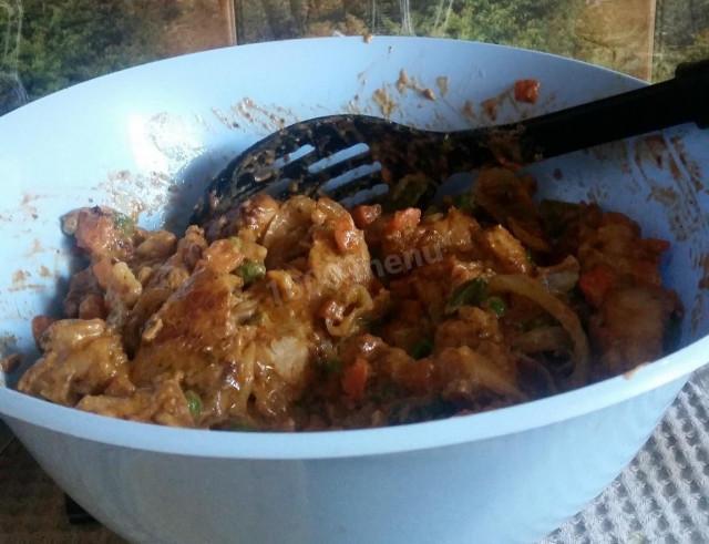 Пока овощи жарятся, готовим соус. Смешиваем кетчуп, сметану, соевый соус. Обжариваем индейку с подсолнечным маслом в мультиварке 25 мин. Смешиваем с поджаренными заранее овощами, луком и соусом. Жарим еще 10 мин. Пока не остыло подавайте к столу.