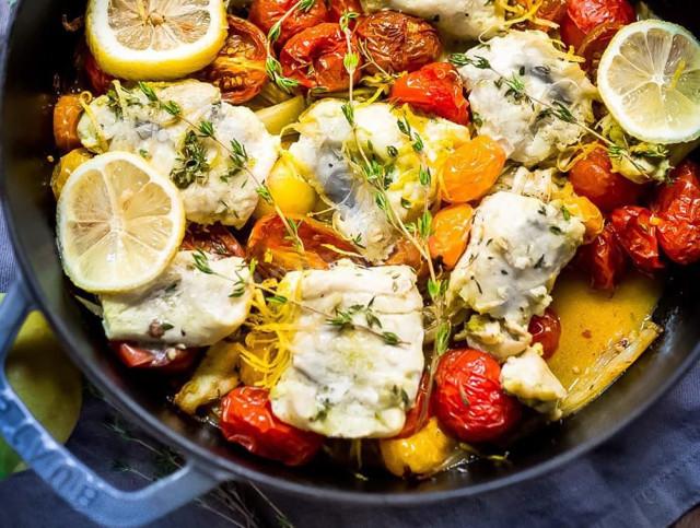 6. По прошествии указанного времени вынуть форму с овощами из духовки и выложить среди овощей кусочки уже промариновавшегося рыбного филе. Сверху полить рыбу и овощи остатками маринада. И снова поставить форму в духовку примерно на 7-8 минут для того, чтобы рыба запеклась.