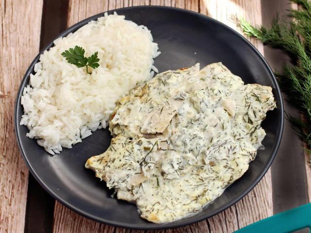 Диетическое рыбное блюдо! Приготовь вкусный и полезный ужин! Нежное филе минтая в соусе из сметаны с укропом - только мясо рыбы, без костей и кожи. Запекание в духовке превращает его в идеальное и низкокалорийное основное блюдо с нежным соусом, которое отлично сочетается с любым гарниром.