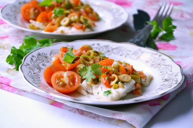 6. Форму для запекания смазать растительным маслом. Выложить в форму рыбу. Сверху распределить смесь из помидоров, оливок и зелени. Сбрызнуть рыбу оливковым маслом.