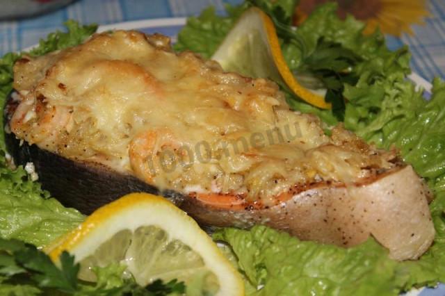 Получившийся коктейль выложить на филе форели в форме лодочки. Формировать руками, чтобы он закрывал стейки.