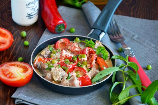 Выложите к индейке помидоры, сладкий перец и зеленый горошек, перемешайте и жарьте все вместе еще 3 минуты.