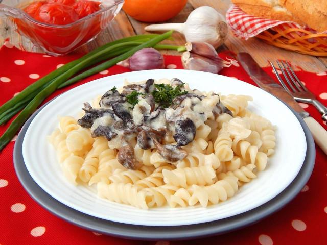 Вливаем сливки. Сливки можно заменить жирной и густой сметаной, грибы получатся еще вкуснее и нежнее. Но если будет использоваться сметана, то сметану нужно развести в какой-либо емкости с водой и добавить столовую ложку пшеничной муки. Вливаем сливочный соус в сковороду с грибами и тушим их на медленном огне под крышкой около 10 минут.