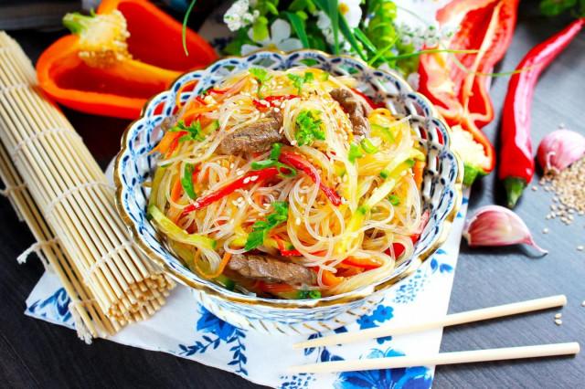 Яркий, красивый салат на праздник и на каждый день! Фунчоза с говядиной и овощами - это и салат, и полноценное блюдо азиатской кухни, два в одном. Она вкусна в тёплом и в холодном виде. Отличное решение для праздничного стола!