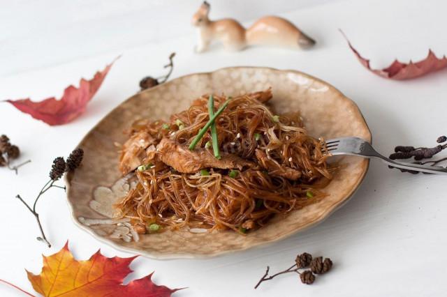 6. Перекладываем фунчозу к курице, перемешиваем, чтобы стеклянная лапша успела впитать соус и сок. Отключаем огонь, держим под закрытой крышкой еще парочку минут.