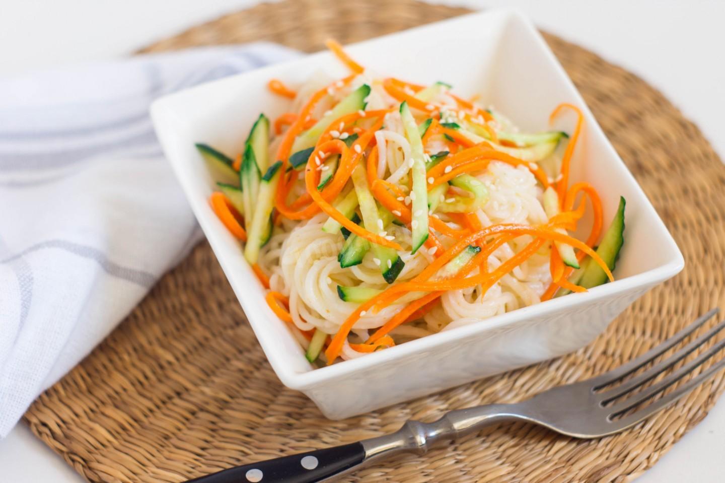 Добавьте в миску к лапше измельченные свежие огурцы, морковь по-корейски, пряности по вкусу и другие ингредиенты на свое усмотрение, например уксус, лимонный сок или соевый соус.