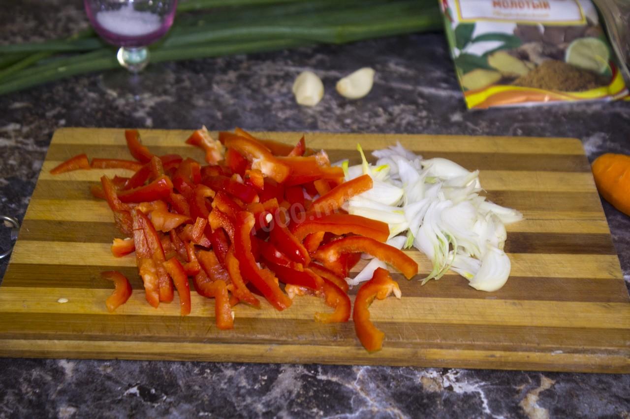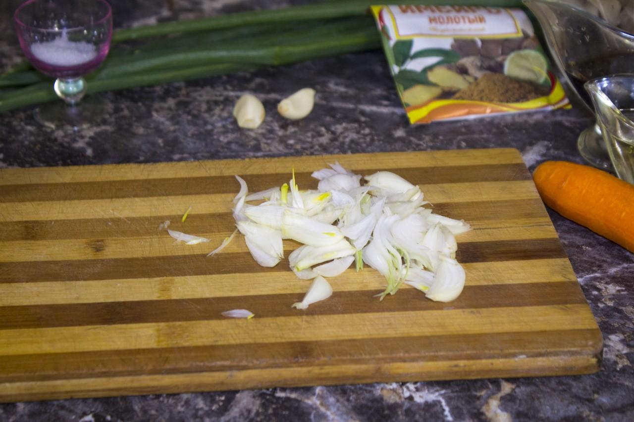 Нарезаем лук полукольцами или же, как я, режем его поперек