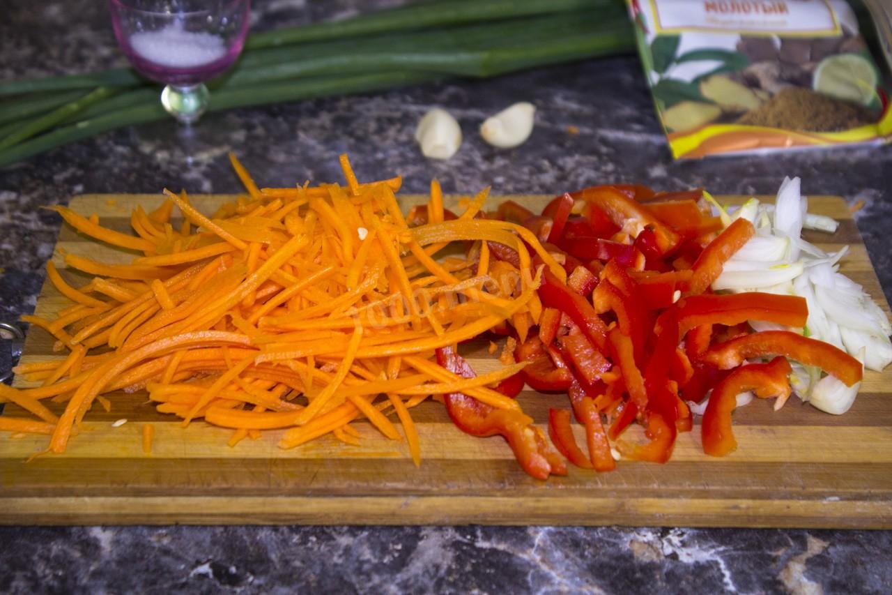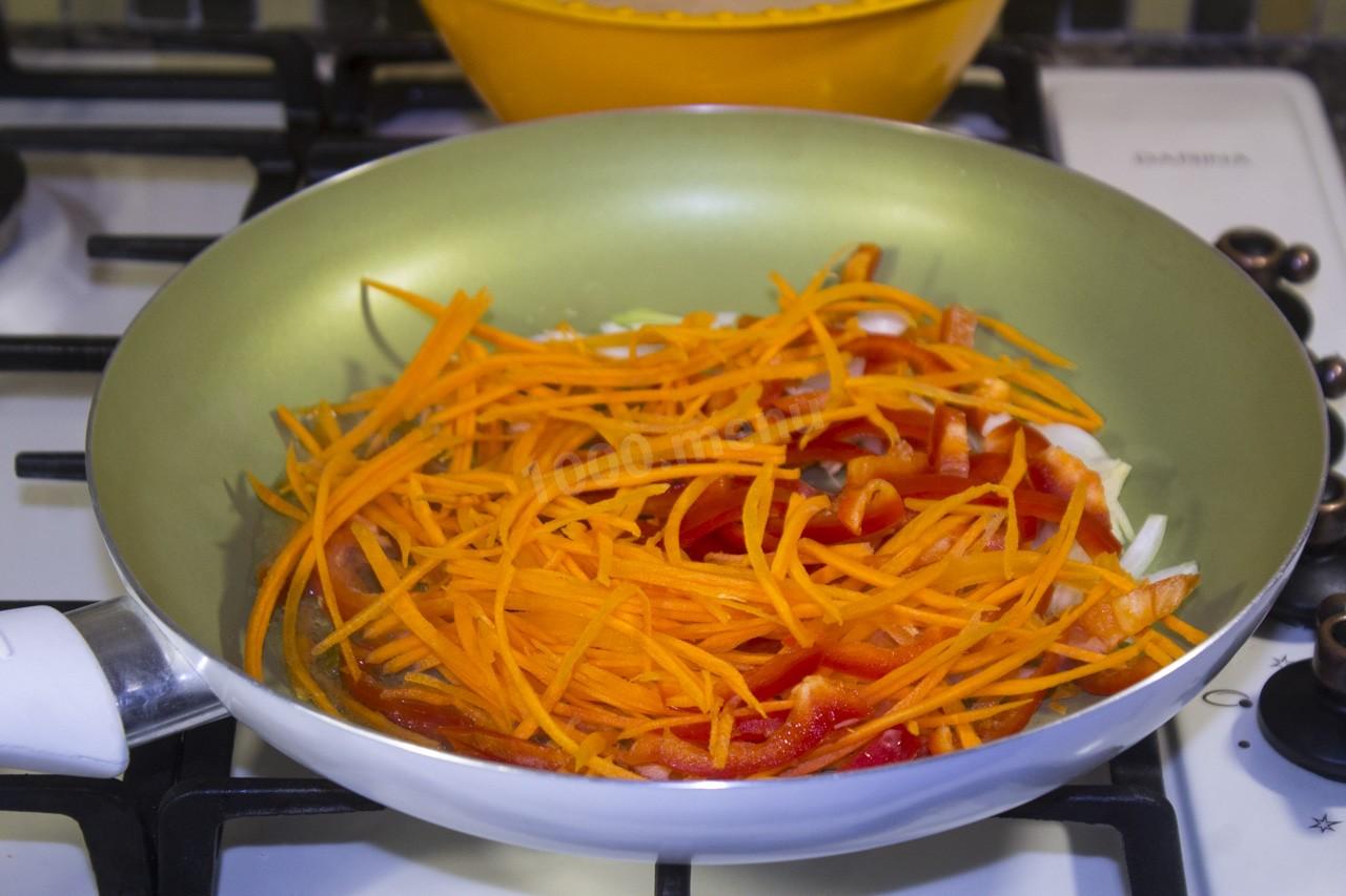 На разогретой сковороде с растительным маслом быстро обжариваем овощи - они должны стать совсем немного мягкими, но внутри остаться хрустящими. На это нам потребуется примерно 2-3 минуты