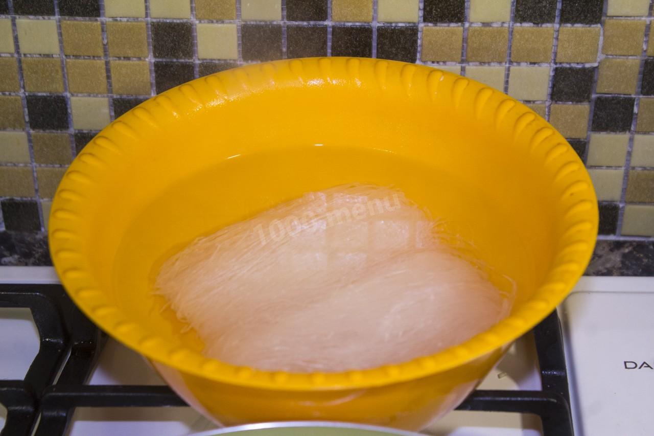 Фунчозу заливаем кипятком (примерно 1 л) и оставляем на 7-10 минут. Впрочем, здесь смотрим на советы на упаковке)