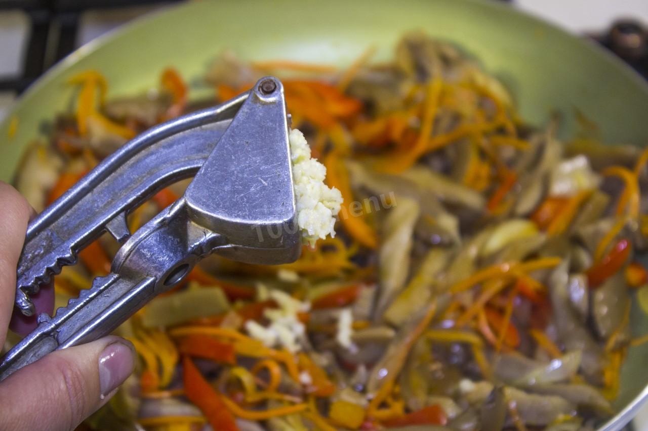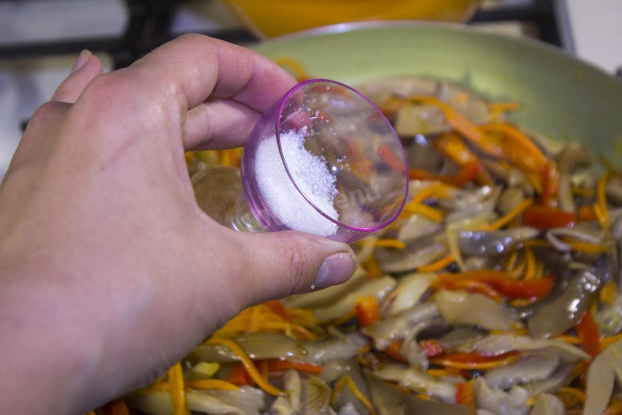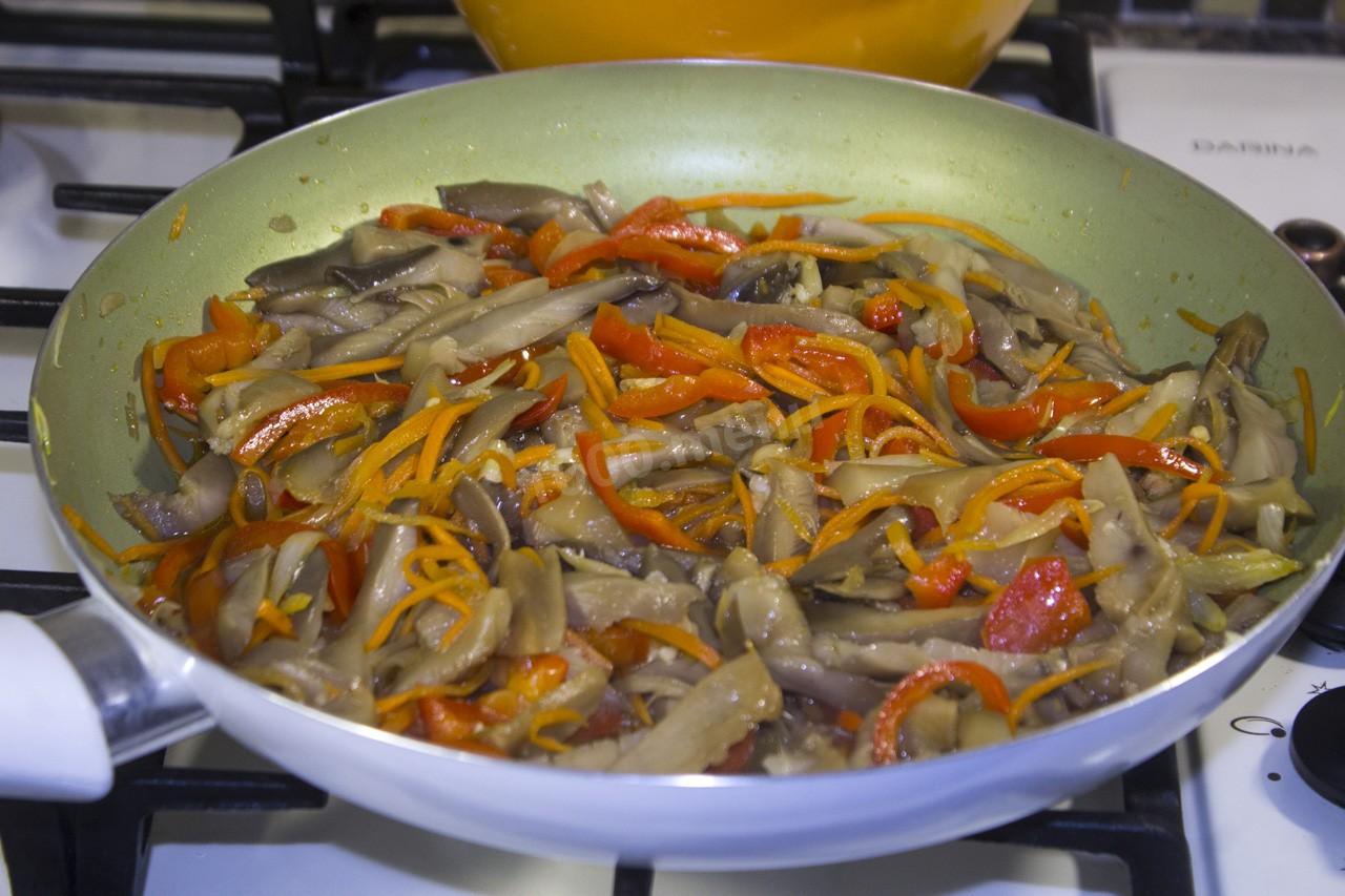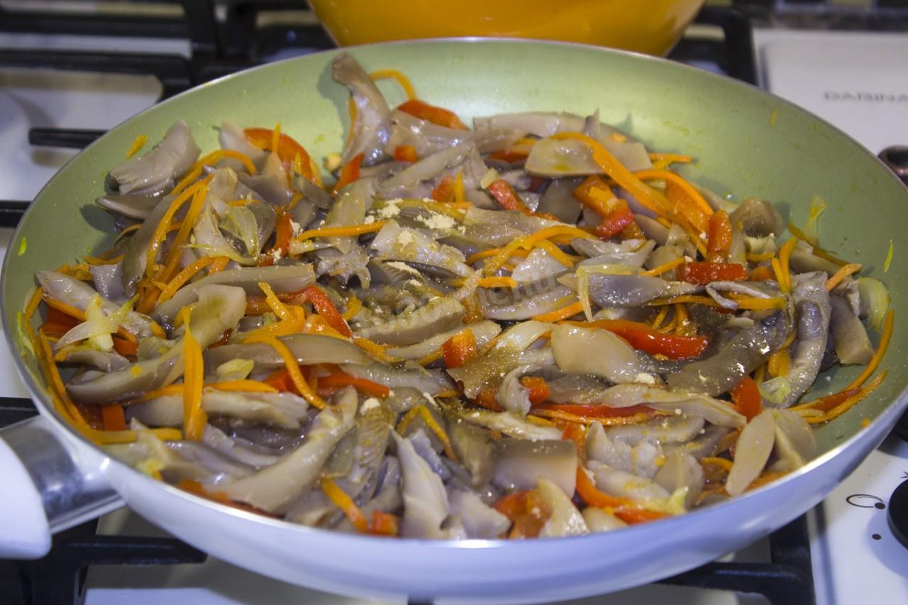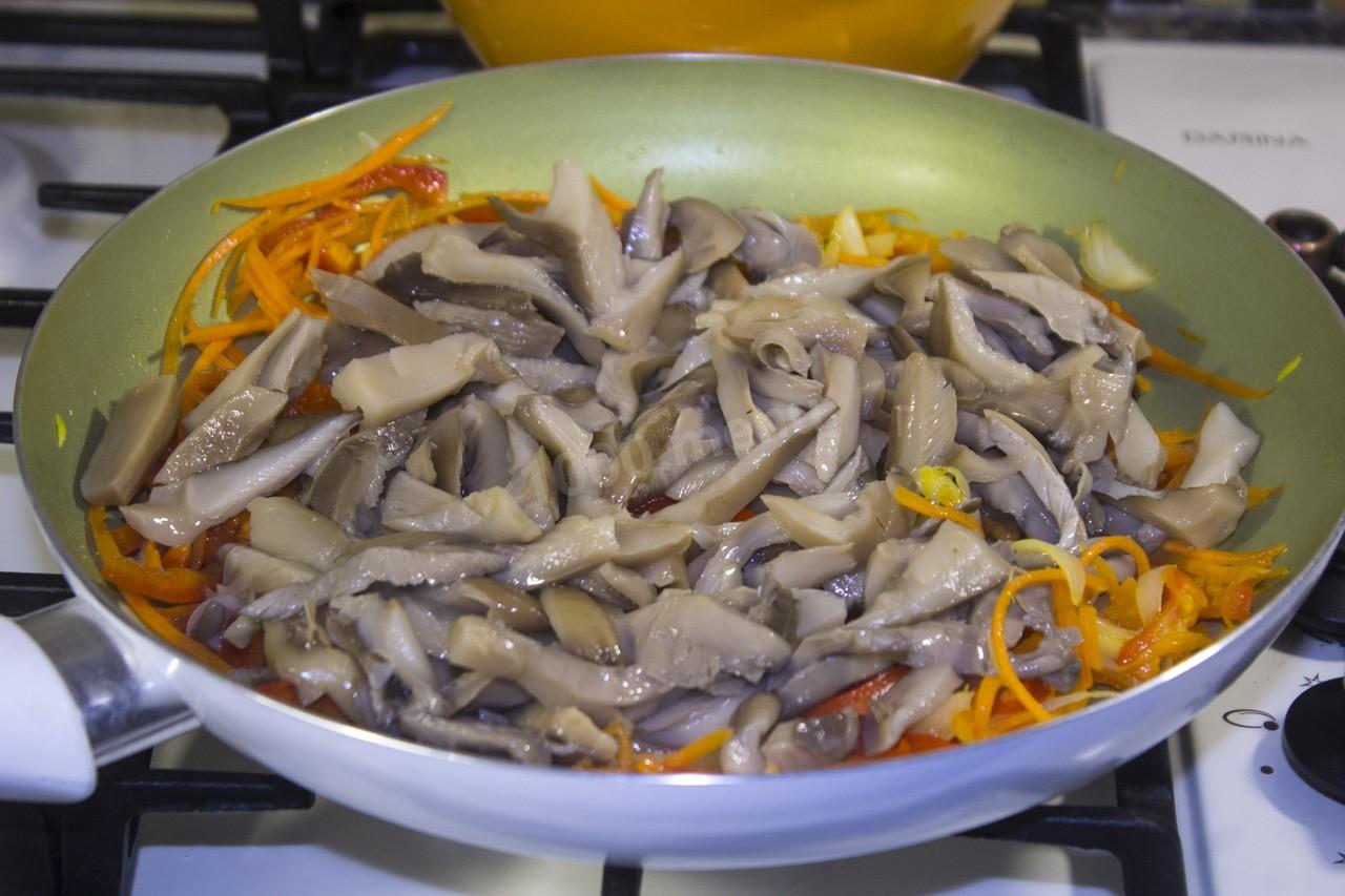Затем добавляем грибы - у меня маринованные вешенки, но подойдут любые грибы, но их нужно предварительно отварить или обжарить (в зависимости от грибов), к этому блюду отлично подойдут сухие шиитаке