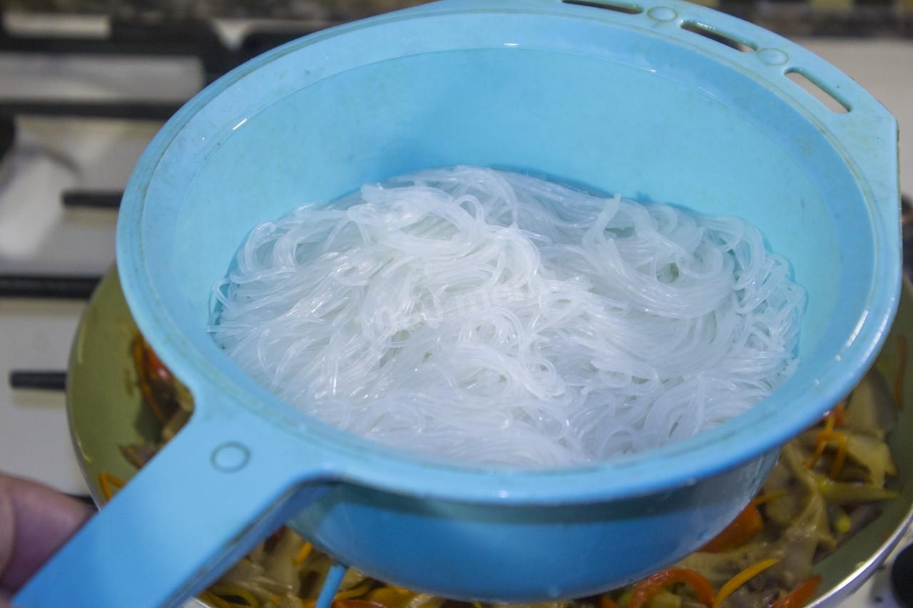 К этому времени фунчоза уже наверняка готова - ее откидываем на дуршлаг и промываем холодной водой