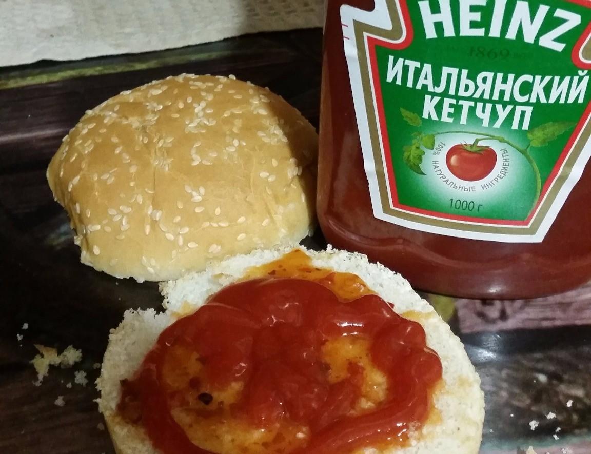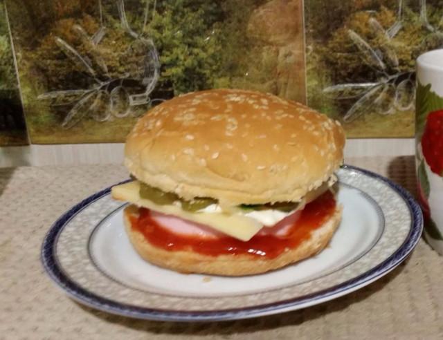 Готовую булочку для гамбургеров разрезайте на 2 части. Все выкладывается слоями на нижнюю часть булочки и сверху накрыть второй половинкой булочки.