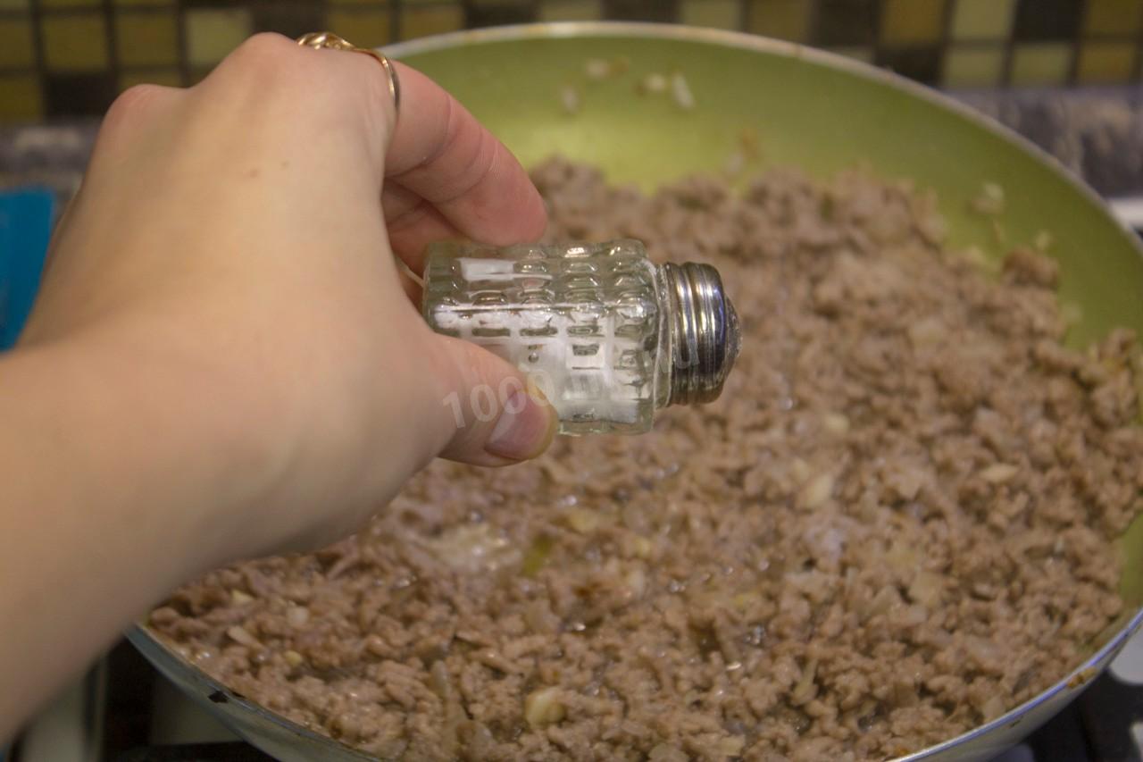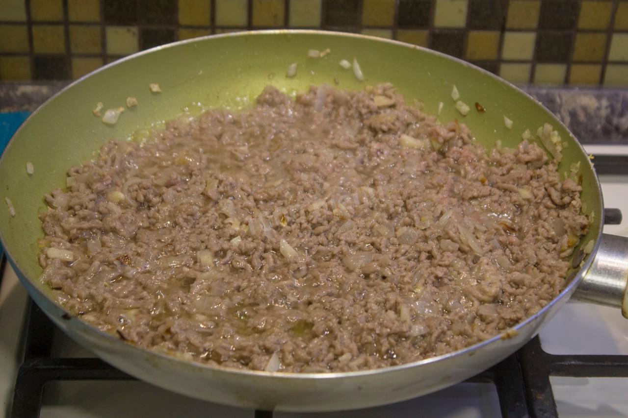 Говяжий фарш обжариваем вместе с луком, разминая комочки
