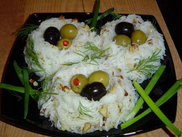Выложить вермишель в форме гнезд. В центр уложить оливки, маслины, имитируя птичьи яйца. Блюдо украсить зеленью.