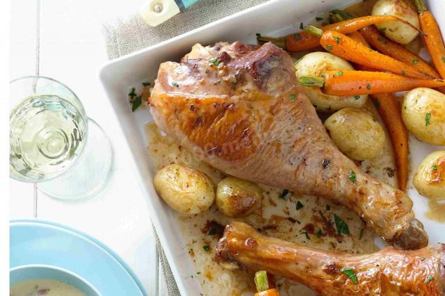 Любишь индейку? Тогда этот рецепт для тебя! Голень индейки с картошкой - аппетитное, сытное и полезное блюдо. Вкупе с обжаренными овощами, лимонным соком и белым сухим вином нежное мясо индейки дает неповторимый вкус и аромат.