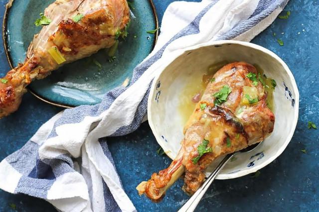 Голени индейки можно подавать с любым гарниром (овощами, рисом, спагетти), полив соусом.