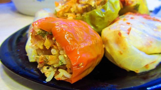 Мясо режем мелкими кубиками (легче если немного его подморозить). Обжариваем на растительном масле 10 минут. Лук мелко режем, морковку и корень петрушки натираем на терке, отправляем к мясу в сковороду, тушим еще 10 минут, добавляем половину томатного сока и еще немного тушим. Выключаем огонь, добавляем промытый рис, петрушку (мелко порезанную), соль. Капусту целым кочаном отправляем в большую кастрюлю с кипящей водой на 15 минут. Листья отлично отделяются. Фаршируем перец и капустные листья. Укладываем в форму для запекания ( если запекать в духовке) или в кастрюлю (если варить на огне). На голубцы выливаем оставшуюся часть томатного сока, сливочное масло кусочками , соль и капустный отвар ( в котором варился кочан капусты) наполовину. Можно варить или запекать в духовке 40-50 минут.