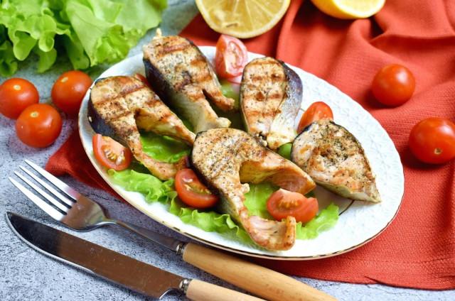 Сковороду гриль поставьте на огонь и разогрейте до горячего состояния. Этой же кисточкой немного смажьте и сковороду маслом. Выложите на горячую сковороду подготовленные рыбные стейки и обжарьте их по 2-3 минуты с каждой стороны.