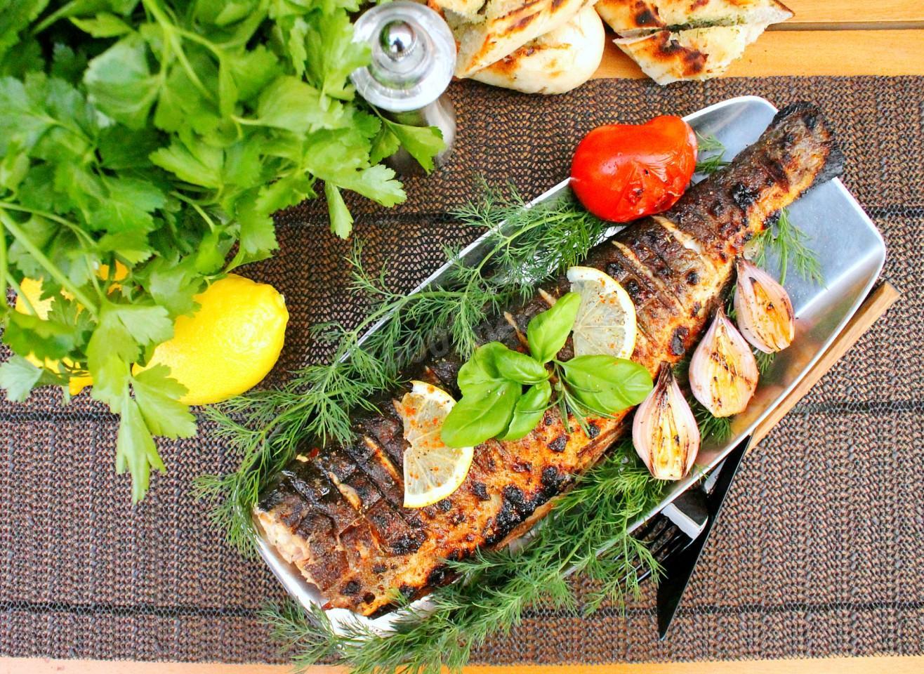 Готовую горбушу можно подать с овощами, запечёнными на решётке на углях.