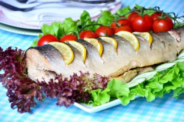 В надрезы вкладываем ломтики лимона. Сверху поливаем оставшимся оливковым маслом. Заворачиваем рыбу в фольгу. Запекаем в разогретой до 190 С духовке до готовности около 30 минут.