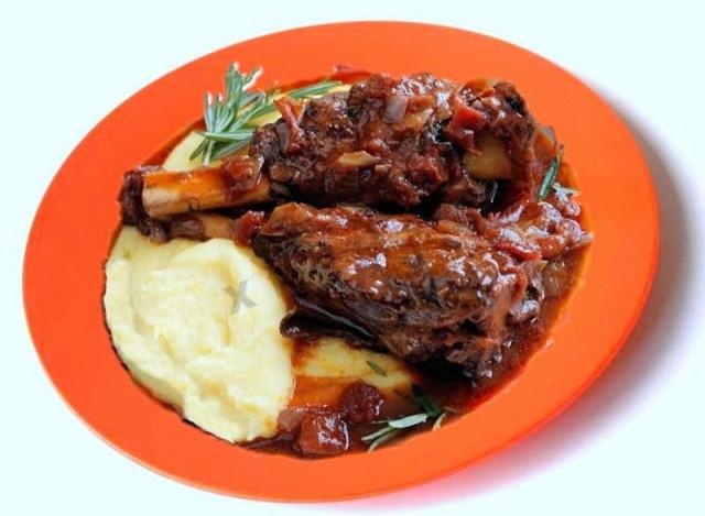 Переложите мясо с костью к луку в кастрюлю для тушения. Залейте бальзамический уксус (можно взять самый дешевый), рубленые помидоры в собственном соку, кипяток. Все размешайте, закройте крышкой и поставьте часов на 6-7 в духовку. Там блюдо должно томиться до тех пор, пока мясо не будет легко расходиться на волокна. Раз в 2 часа нужно перемешивать блюдо. Если мясо будет выглядеть сухим, доливайте в него горячей воды.