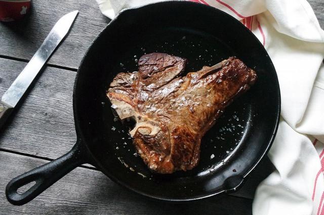 Далее выключаем духовку и оставляем мясо в ней в течение 10 минут. В это время нагреваем на сильном огне сковороду с оставшимся маслом. Когда масло раскалится, выкладываем мясо в сковородку и обжариваем его в течение 1 минуты, после мясо переворачиваем и обжариваем еще 1 минуту с другой стороны. На мясе должна появиться восхитительная аппетитная корочка.