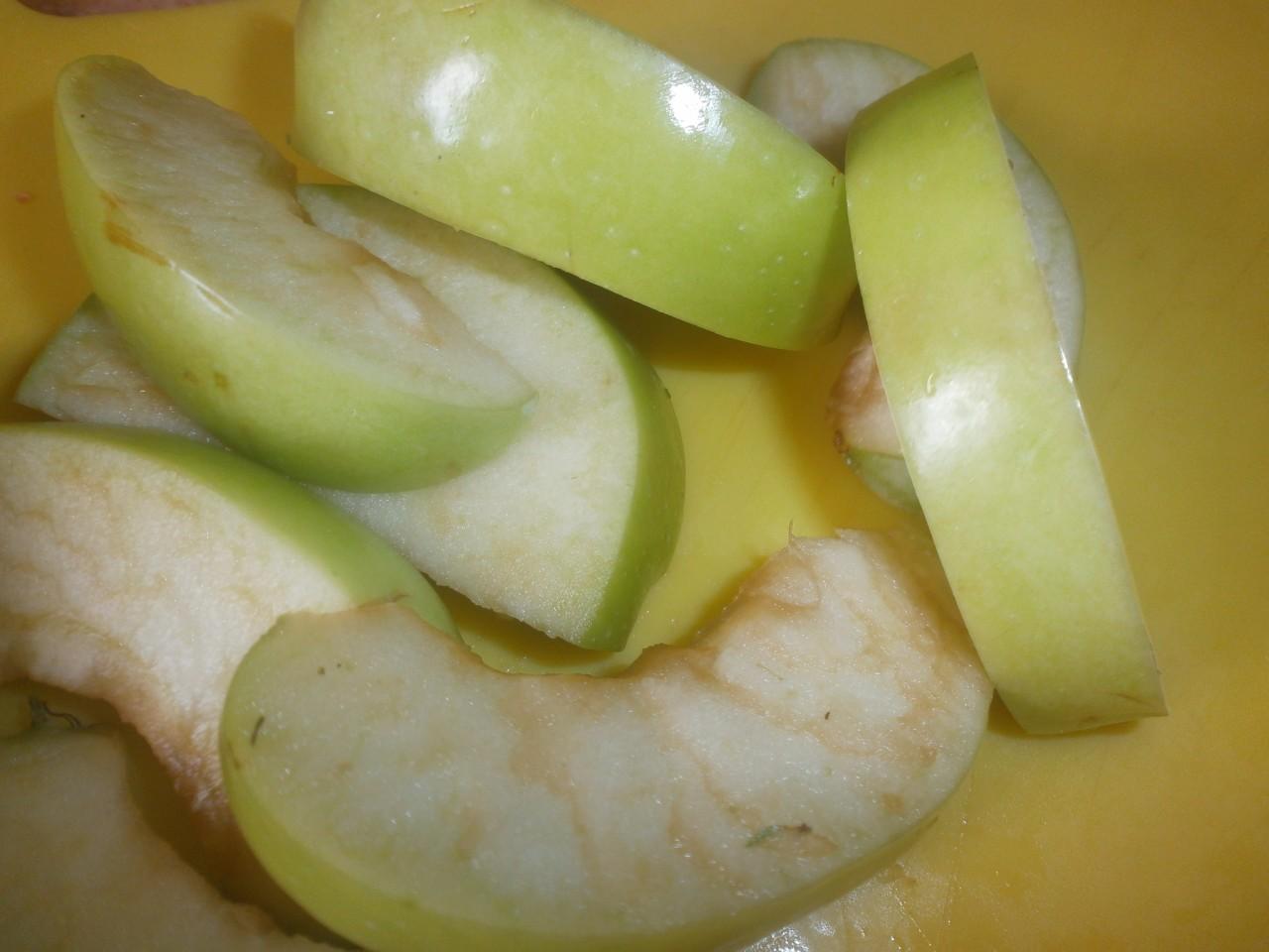 Вот очередь дошла и до яблока.Моем его ,удаляем сердцевину и режим на дольки.Дольки крупные. Главное,что бы долек было не меньше, чем кусочков печени( в идеале равное количество)Ну а если больше -- то не страшно.